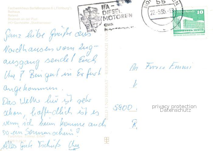 73649773 alte Postkarte Nordhausen Thueringen Fachwerkhaus Barfuessergasse 6 Flohburg Rathaus Roland Statue Brunnen Post HO Gaststaette Stadtterrasse postalisch gelaufen Erhaltung siehe scans [FriedD77] KatCode: 11110016062041