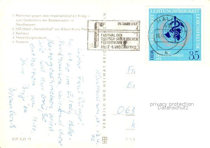 73159101 alte Postkarte Nordhausen Thueringen Mahnmal Hotel-Handelshof Meyenburgmuseum Postamt postalisch gelaufen Erhaltung siehe scans [LiesaD40] KatCode: 11110016062041