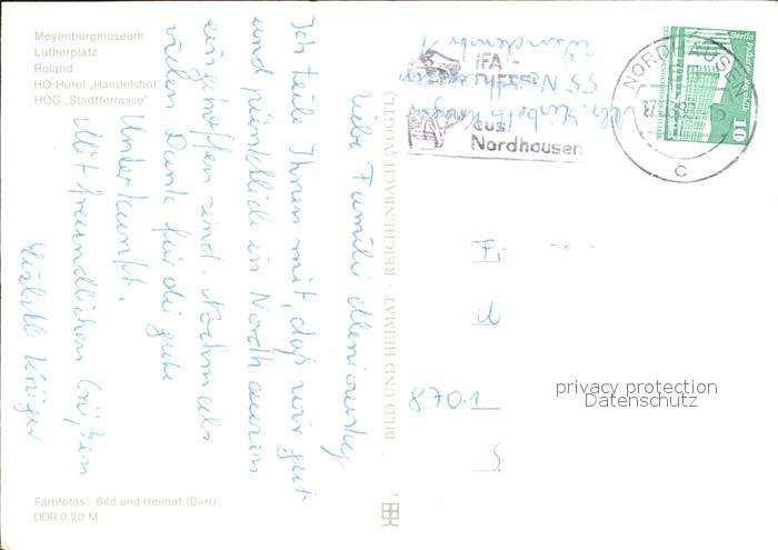 72371459 alte Postkarte Nordhausen Thueringen Meyenburgmuseu Lutherplatz Roland Hotel Handelshof postalisch gelaufen Erhaltung siehe scans KatCode: 11110016062041