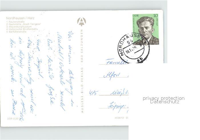 72413855 alte Postkarte Nordhausen Thueringen Rautenstrasse Gaststaette Stadt Terrasse Meyenburgmuseum Historische Strassenbahn Barfuesserstrasse Fachwerkhaeuser postalisch gelaufen Erhaltung siehe scans KatCode: 11110016062041