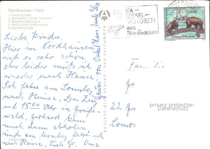 72202725 alte Postkarte Nordhausen Thueringen Rautenstrasse Historische Strassenbahn Barfuesserstrasse postalisch gelaufen Erhaltung siehe scans KatCode: 11110016062041