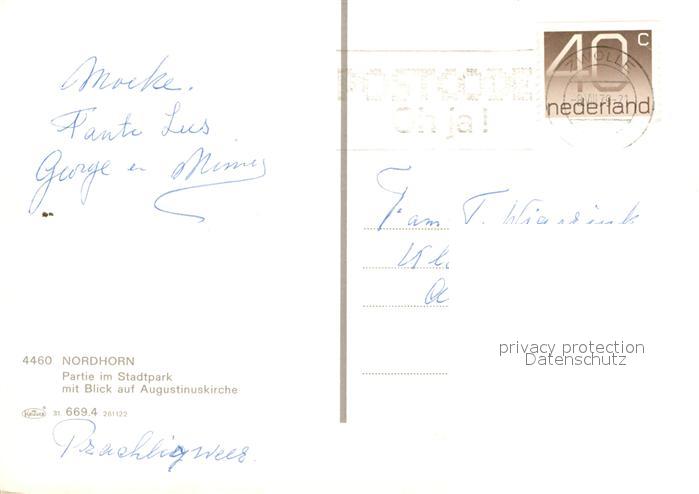 72942911 alte Postkarte Nordhorn Partie im Stadtpark Blick auf Augustinuskirche postalisch gelaufen Erhaltung siehe scans [FriedD77] KatCode: 11110003456015