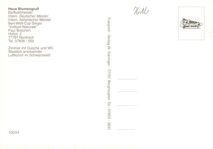 73930742 Nordrach Panorama Haus Blumengruss Bartweltmeister Paul Boschert postalisch nicht gelaufen Erhaltung siehe scans [FriedD77] KatCode: 11110008317085