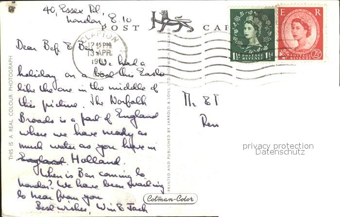 old postcard Norfolk Norwich Wroxham Bridge Segelboot Motorboot postalisch gelaufen Erhaltung siehe scans