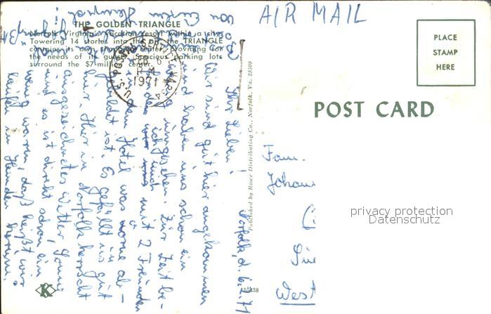 72134392 old postcard Norfolk Virginia The Golden Triangle Motor Hotel postalisch gelaufen Erhaltung siehe scans KatCode: 14140490000000
