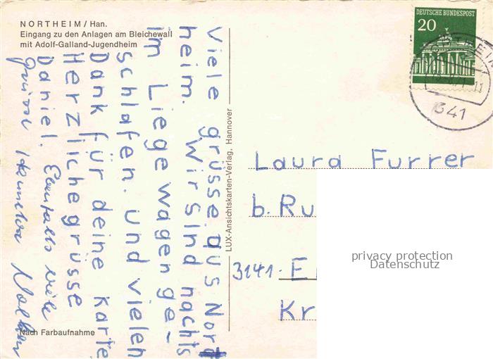 74153157 alte Postkarte Northeim Niedersachsen Eingang zu den Anlagen am Bleichewall mit Adolf Galland Jugendheim postalisch gelaufen Erhaltung siehe scans [WerneD78] KatCode: 11110003155011