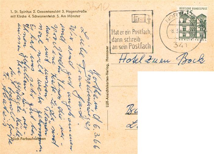 73937521 alte Postkarte Northeim Niedersachsen St Spiritus Panorama Hagenstrasse mit Kirche Schwanenteich Am Muenster postalisch gelaufen Erhaltung siehe scans [WerneD78] KatCode: 11110003155011