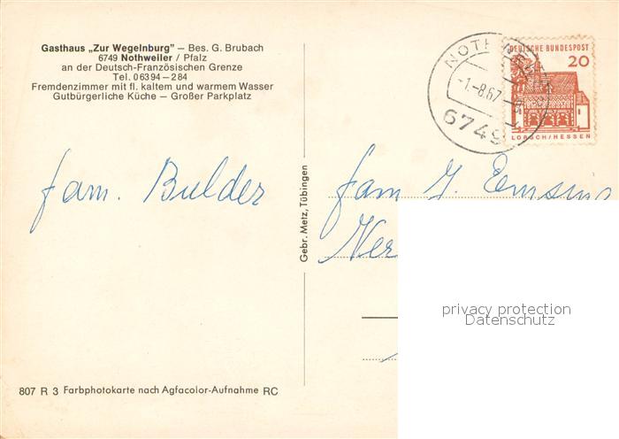 73717170 alte Postkarte Nothweiler Gasthaus Zur Wegelnburg postalisch gelaufen Erhaltung siehe scans [WerneD78] KatCode: 11110007340034