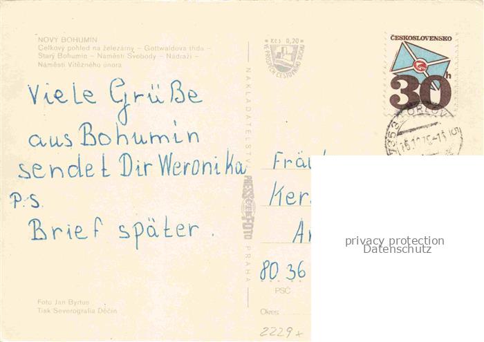 74156908 old postcard Novy-Bohumin Neu-Oderberg Bohumin CZ Gottwaldova-Třída Nádraží Náměstí-Svobody Eisenhuette Kirche Altstadt Strassenbahn postalisch gelaufen Erhaltung siehe scans [Karloger] KatCode: 11520