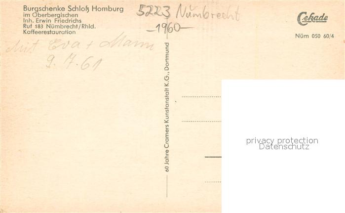 73693809 Nuembrecht Burgschenke Schloss Homburg Oberbergisches Land postalisch nicht gelaufen Erhaltung siehe scans [FriedD77] KatCode: 11110005374032