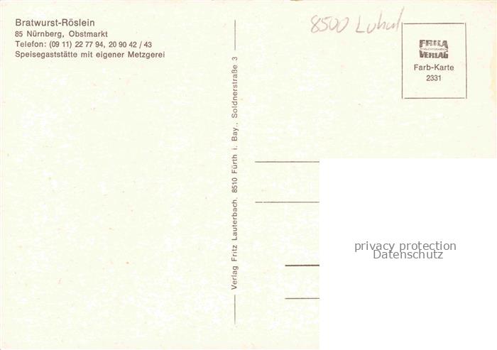 74049406 NueRNBERG CITY Bratwurst-Roeslein Gaststaette Metzgerei postalisch nicht gelaufen Erhaltung siehe scans [FriedD77] Frie Katcode 11110009564000