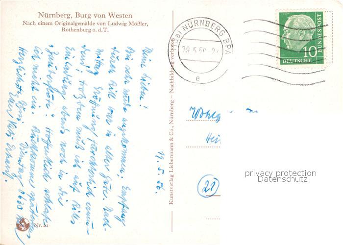 72955878 alte Postkarte NueRNBERG CITY Burg von Westen nach Originalgemaelde von Ludwig Moessler Kuenstlerkarte postalisch gelaufen Erhaltung siehe scans [FriedD77] KatCode: 11110009564000