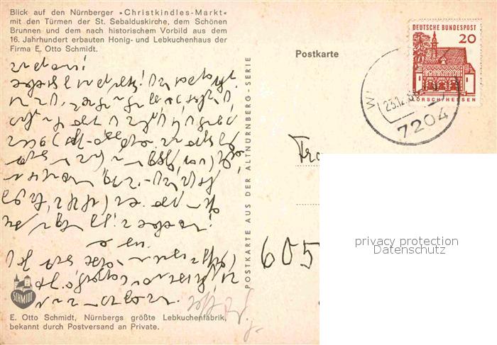72850819 alte Postkarte NueRNBERG CITY Christkindlesmarkt Tuerme St Sebalduskirche Schoener Brunnen Lebkuchenhaus Weihnachtskarte Neujahrskarte postalisch gelaufen Erhaltung siehe scans [FriedD77] KatCode: 11110009564000