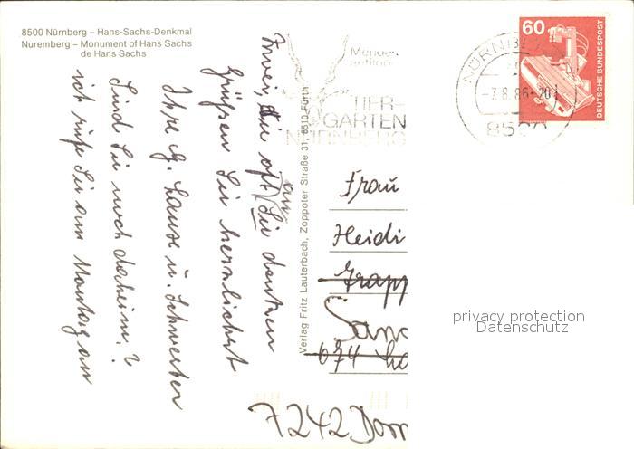 72378378 alte Postkarte NueRNBERG CITY Hans Sachs Denkmal postalisch gelaufen Erhaltung siehe scans KatCode: 11110009564000