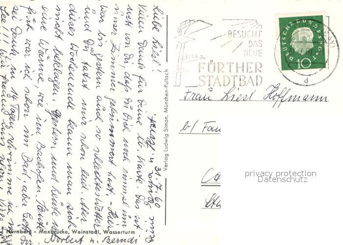 72927439 alte Postkarte NueRNBERG CITY Maxbruecke Wasserturm postalisch gelaufen Erhaltung siehe scans [LiesaD40] KatCode: 11110009564000