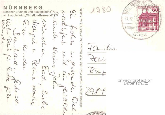72898059 alte Postkarte NueRNBERG CITY Schoener Brunnen und Frauenkirche am Hauptmarkt Christkindlesmarkt postalisch gelaufen Erhaltung siehe scans [FriedD77] KatCode: 11110009564000