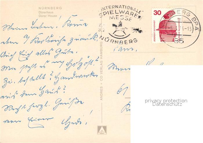 73357740 alte Postkarte Nuernberg Duererhaus Fachwerkhaus Historisches Gebaeude Altstadt postalisch gelaufen Erhaltung siehe scans [FriedD77] KatCode: 11110009564000