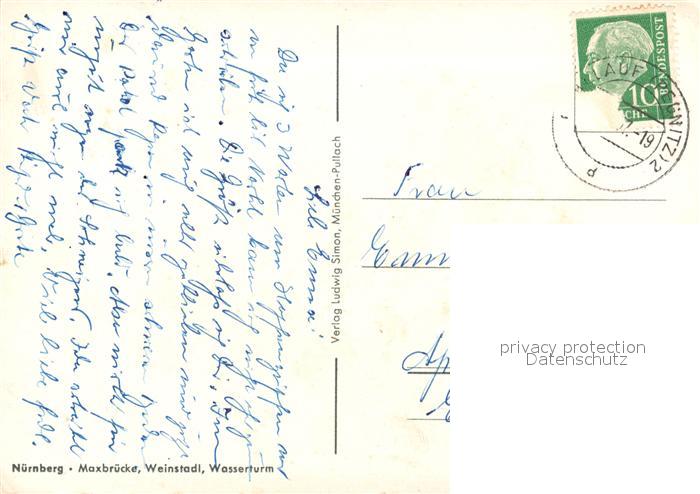 73131855 alte Postkarte Nuernberg Maxbruecke Weinstadl Wasserturm postalisch gelaufen Erhaltung siehe scans [FriedD77] KatCode: 11110009564000