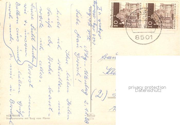 73611162 alte Postkarte Nuernberg Stadtpanorama mit Burg vom Plaerrer postalisch gelaufen Erhaltung siehe scans [WerneD78] KatCode: 11110009564000