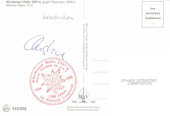 72891101 Nuernbergerhuette mit Feuerstein und Stubaier Alpen postalisch nicht gelaufen Erhaltung siehe scans [WerneD78] KatCode: 11390332070334