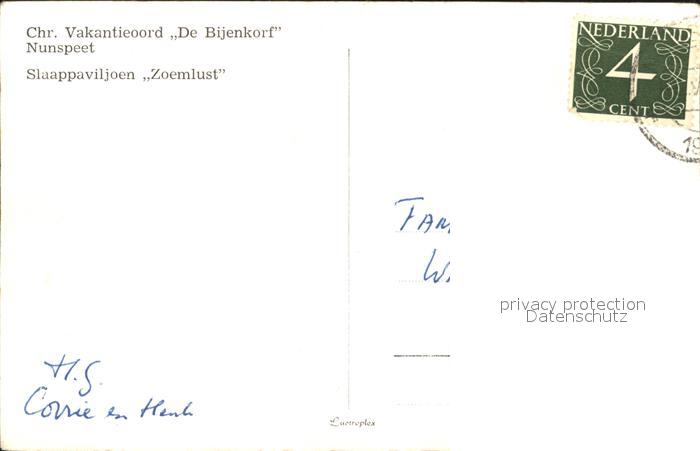 alte Postkarte Nunspeet Chr. Vakantieoord De Bijenkorf Slaappaviljoen Zoemlust postalisch gelaufen Erhaltung siehe scans