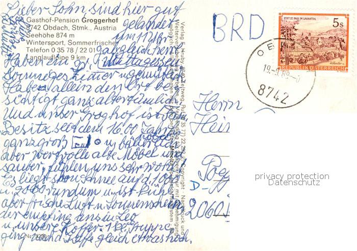 73522118 alte Postkarte Obdach Gasthof Pension Groggerhof postalisch gelaufen Erhaltung siehe scans [WerneD78] KatCode: 11390226060810