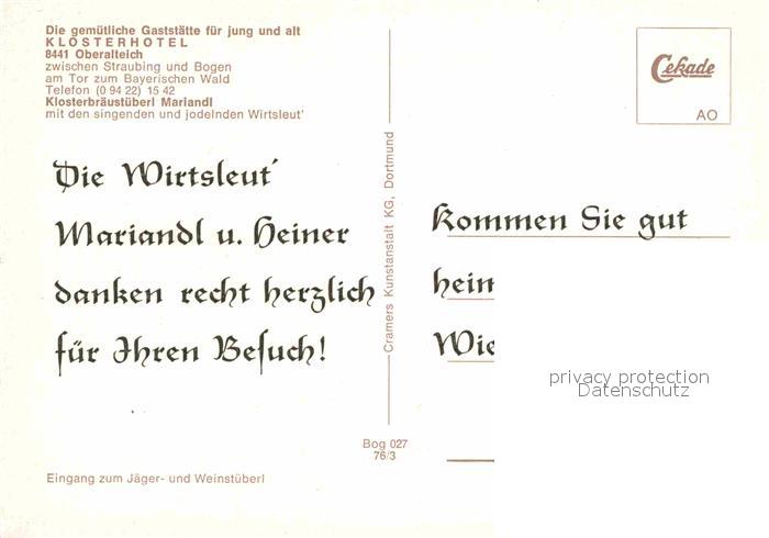 72724130 Oberalteich Gaststaette Klosterhotel Klosterbraeustueberl Mariandl Jaegerstueberl Weinstube postalisch nicht gelaufen Erhaltung siehe scans [FriedD77] KatCode: 11110009278118