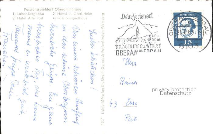 72448176 alte Postkarte OBERAMMERGAU Bayern Laber Bergbahn Haensl und Gretl Heim Hotel Alte Post Passionsspielhaus postalisch gelaufen Erhaltung siehe scans KatCode: 11110009180125