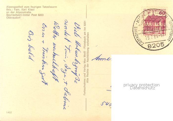73166491 alte Postkarte Oberaudorf Alpengasthof zum feurigen Tatzelwurm Alpenstrasse Bayrischzell Inntal postalisch gelaufen Erhaltung siehe scans [FriedD77] KatCode: 11110009187157