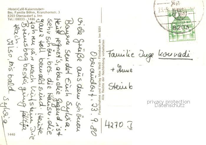 73776350 alte Postkarte Oberaudorf Inn Hotel-Cafe-Kaiserstuben Aussenansicht postalisch gelaufen Erhaltung siehe scans [LiesaD40] KatCode: 11110009187157
