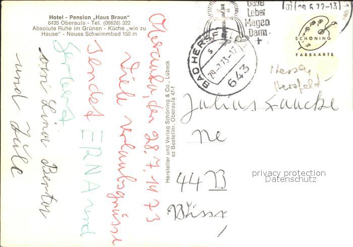 72922090 alte Postkarte Oberaula Pension Haus Braun postalisch gelaufen Erhaltung siehe scans [MatthD68] KatCode: 11110006634019