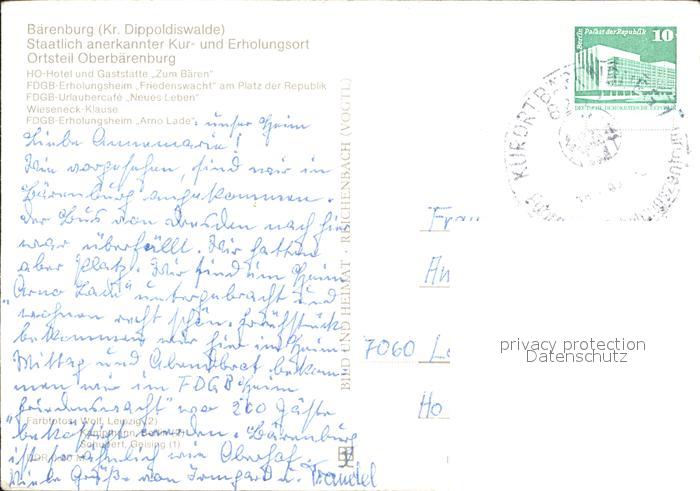 72455858 alte Postkarte Oberbaerenburg Baerenburg Hotel und Gaststaette Zum Baeren Erholungsheim Friedenswacht Cafeè Neues Leben postalisch gelaufen Erhaltung siehe scans KatCode: 11110014290010