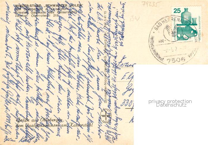73653163 alte Postkarte Oberbergen Vogtsburg Winzer Stube Schwarzer Adler postalisch gelaufen Erhaltung siehe scans [WerneD78] KatCode: 11110008315133