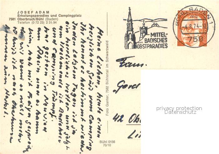 73727657 alte Postkarte Oberbruch Buehl Campingplatz und Erholungsparadies Adam Badesee postalisch gelaufen Erhaltung siehe scans [WerneD78] KatCode: 11110008216007