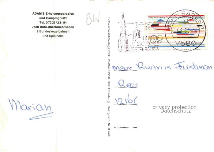 74141883 alte Postkarte Oberbruch Buehl Rastatt BW Adam’s Erholungsparadies und Campingplatz Gaststaette postalisch gelaufen Erhaltung siehe scans [FriedD77] KatCode: 11110008216007