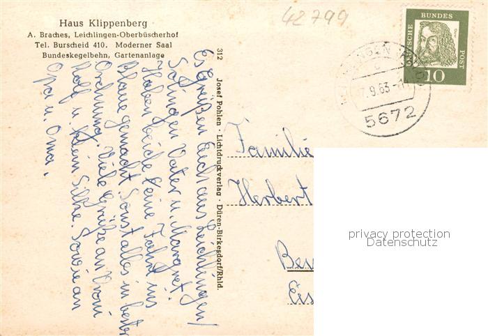 73858248 Oberbuescherhof Leichlingen Haus Klippenberg Gastraum Panorama Blick ins Tal postalisch gelaufen Erhaltung siehe scans [FriedD77] alte Postkarte Frie Katcode 11110005378016