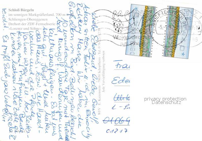 72678666 alte Postkarte Obereggenen Schloss Buergeln Drehort der ZDF Fernsehserie Lorentz und Soehne postalisch gelaufen Erhaltung siehe scans [FriedD77] KatCode: 11110008336078
