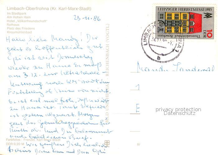 73145094 alte Postkarte Oberfrohna Stadtpark Hoher Hain Wohnsiedlung Hotel Voelkerfreundschaft Rathaus Platz des Friedens Knaumuehlenbad postalisch gelaufen Erhaltung siehe scans [FriedD77] KatCode: 11110014173140