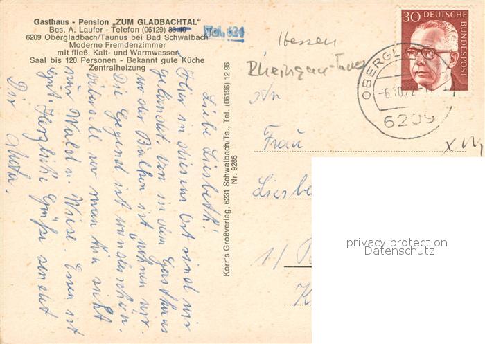 73740522 alte Postkarte Obergladbach Gasthaus Pension Zum Gladbachtal postalisch gelaufen Erhaltung siehe scans [WerneD78] KatCode: 11110006439014
