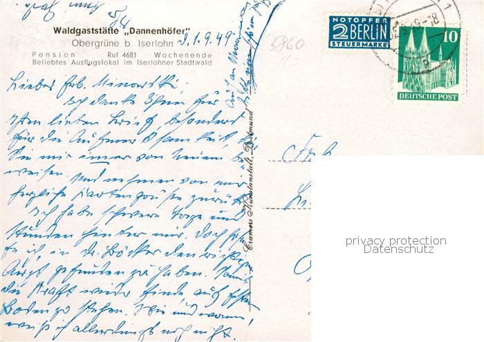 73852627 alte Postkarte Obergruene Waldgaststaette Dannenhoefer postalisch gelaufen Erhaltung siehe scans [WerneD78] KatCode: 11110005962024