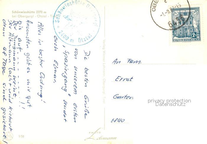 73577007 alte Postkarte Obergurgl Soelden Tirol Schoenwieshuette Berghuette oetztaler Alpen postalisch gelaufen Erhaltung siehe scans [FriedD77] KatCode: 11390