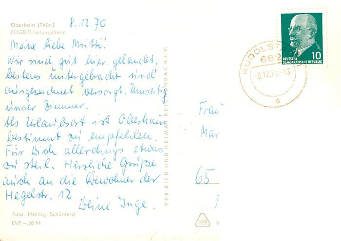 73905679 alte Postkarte Oberhain FDGB Erholungsheim postalisch gelaufen Erhaltung siehe scans [WerneD78] KatCode: 11110016073063