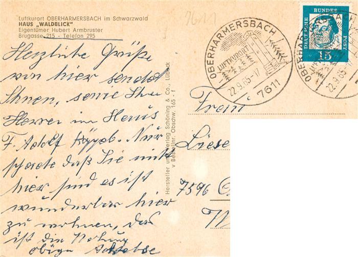 73928008 alte Postkarte Oberharmersbach Gaestehaus Pension Haus Waldblick Luftkurort im Schwarzwald postalisch gelaufen Erhaltung siehe scans [FriedD77] KatCode: 11110008317088
