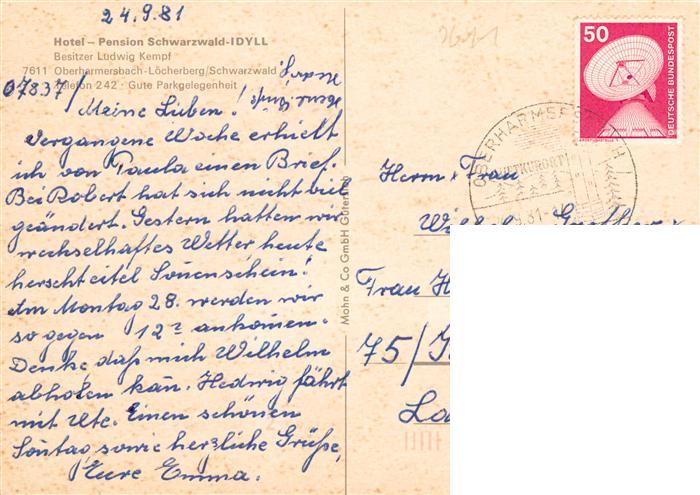 73928608 alte Postkarte Oberharmersbach Hotel Pension Schwarzwald Idyll postalisch gelaufen Erhaltung siehe scans [FriedD77] KatCode: 11110008317088