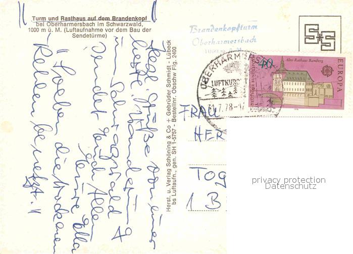 72824197 alte Postkarte Oberharmersbach Turm und Rasthaus auf dem Brandenkopf Schwarzwald Fliegeraufnahme postalisch gelaufen Erhaltung siehe scans [FriedD77] KatCode: 11110008317088