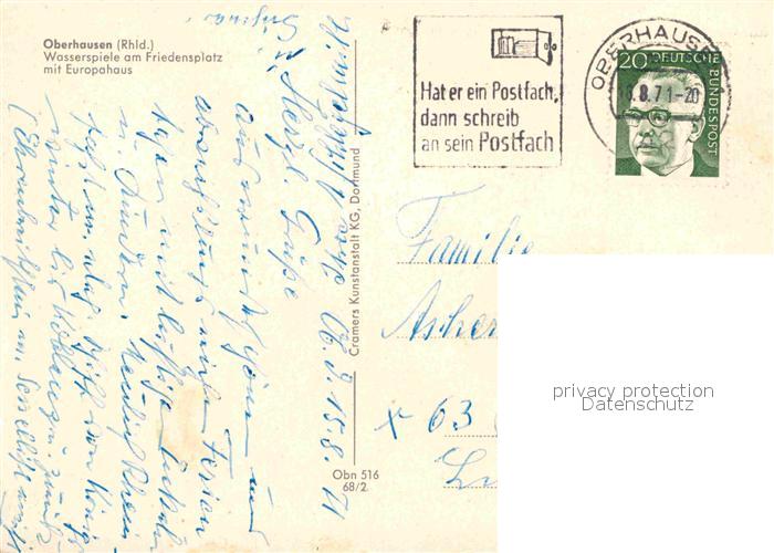 72629493 alte Postkarte Oberhausen Appel Wasserspiele Friedensplatz mit Europahaus postalisch gelaufen Erhaltung siehe scans [WerneD78] KatCode: 11110007333053