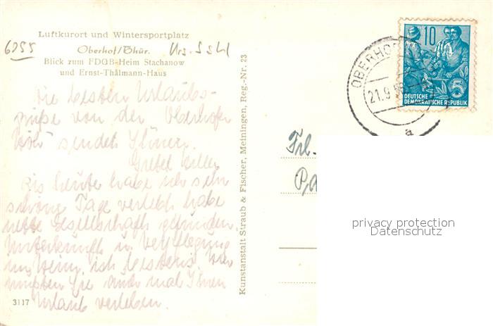73573627 alte Postkarte Oberhof Thueringen Blick zum FDGB Heim Stachanow und Ernst Thaelmann Haus postalisch gelaufen Erhaltung siehe scans [FriedD77] KatCode: 11110016066047