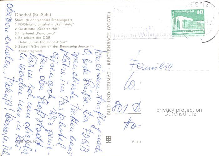 72358001 alte Postkarte Oberhof Thueringen FDGB Erholungsheim Rennsteig Gaststaette Oberer Hof Interhotel Panorama Ernst Thaelmann Haus Sessellift im Kanzlersgrund postalisch gelaufen Erhaltung siehe scans KatCode: 11110016066047