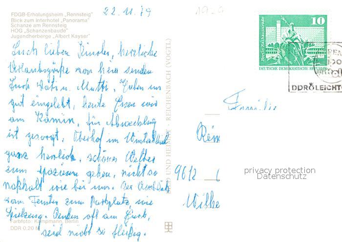 72947281 alte Postkarte Oberhof Thueringen FDGB Erholungsheim Rennsteig Interhotel Panorama Schanze am Rennsteig HOG Schanzenbaude Jugendherberge Albert Kayser postalisch gelaufen Erhaltung siehe scans [WerneD78] KatCode: 11110016066047