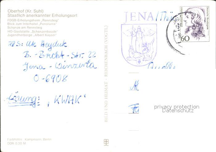 72411536 alte Postkarte Oberhof Thueringen FDGB Erholungsheim Rennsteig Interhotel Panorama Schanze HOG Schanzenbaude Jugendherberge Albert Kayser postalisch gelaufen Erhaltung siehe scans KatCode: 11110016066047